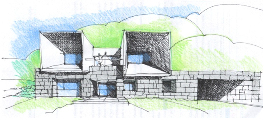 La primera fase lo conforma la P. Baja, netamente de piedra del lugar, casi como una ‘pirca’ mas de las tan características de este valle. Se accede por la cuña situada en uno de los extremos de la parcela que hace las veces de garaje; nada más entrar nos encontramos a la izq. con una estancia de descanso que se separa de la parte social a través del elemento que articula todo el proyecto ‘una galería o porche interior-exterior’ que en el verano se puede usar abierto y en el invierno cerrado. La zona de servicio se sitúa hacia el contra-frente, con huecos de dimensiones mas controladas por ser la orientación de donde provienen los vientos.