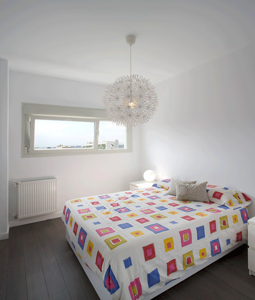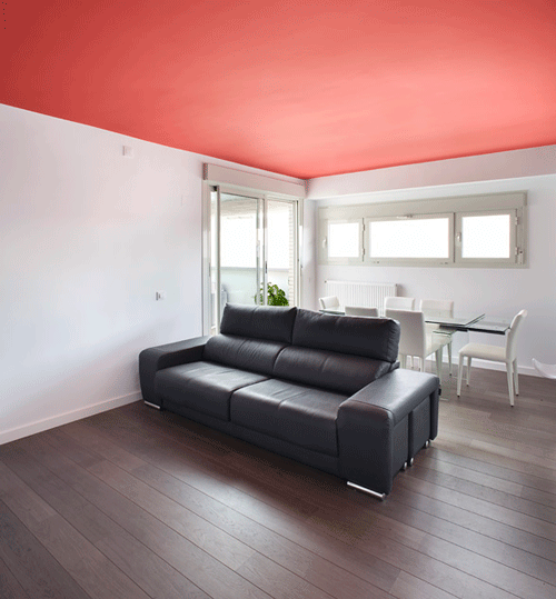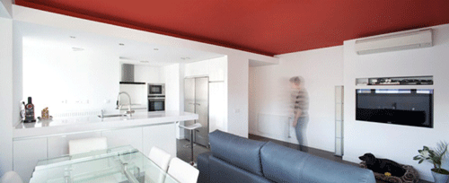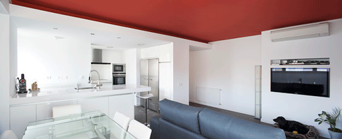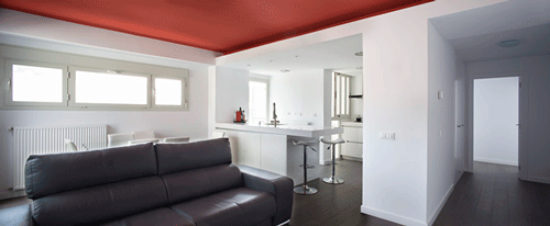 El acento lo pusimos en el falso techo de la estancia que actúa como ‘Pulmón de esta vivienda’, Salón – Comedor – Cocina, pintándolo de un color Rojo Pleno. El efecto que se logra es de gran impacto visual, pues éste se percibe casi al instante de acceder, luego de atravesar el hall de entrada, totalmente blanco, neutro, como el resto de la casa, el propósito es conseguir un gran contraste con este plano que justamente al ser la única nota de color adquiere mucha presencia. Por la noche, una garganta de luz que vale también como divisorio virtual entre salón y cocina aporta mucha calidez al espacio, pues el reflejo de la luz, de tonalidad cálida sobre el rojo se funde y crea una atmósfera muy agradable.