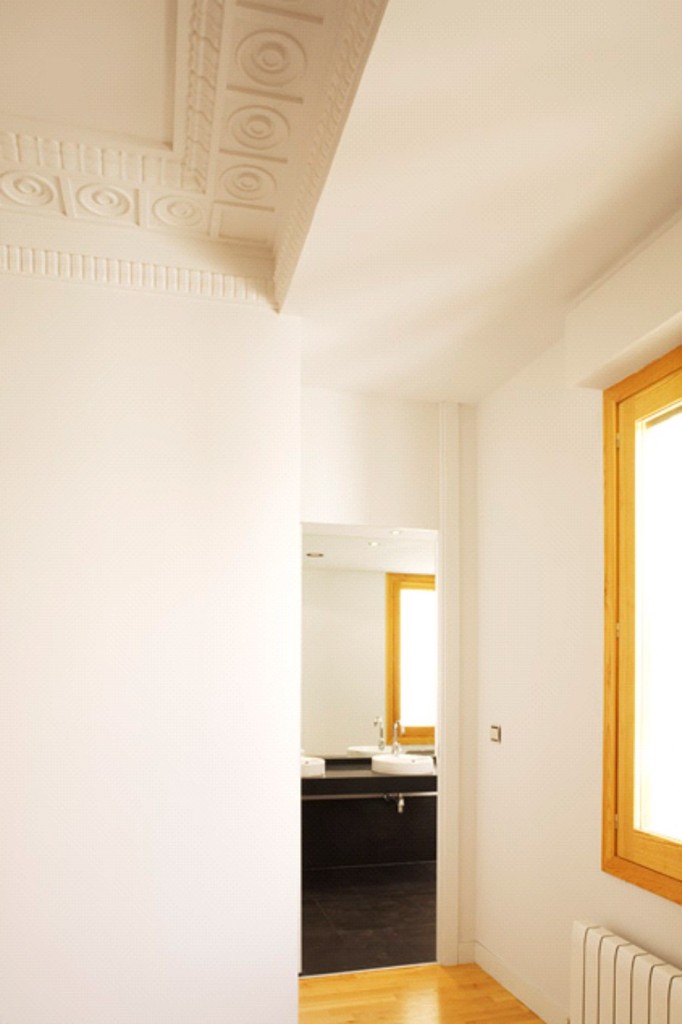 El proyecto intentó ser respetuoso con el origen del edificio en términos generales, totalmente en el exterior y parcialmente en el interior; sobre todo se respetaron las alturas de las estancias y falsos techos de algunas estancias. Se trabajó con materiales de alta gama(ver imágenes) y el desafío fue mantener la parte social de la casa lo mas diáfana posible uniendo la zona de Salón – Comedor principal a la parte de Estudio y Sala situadas a continuación de éste. Para recoger la máxima cantidad de luz el color elegido para los paramentos fue el blanco.