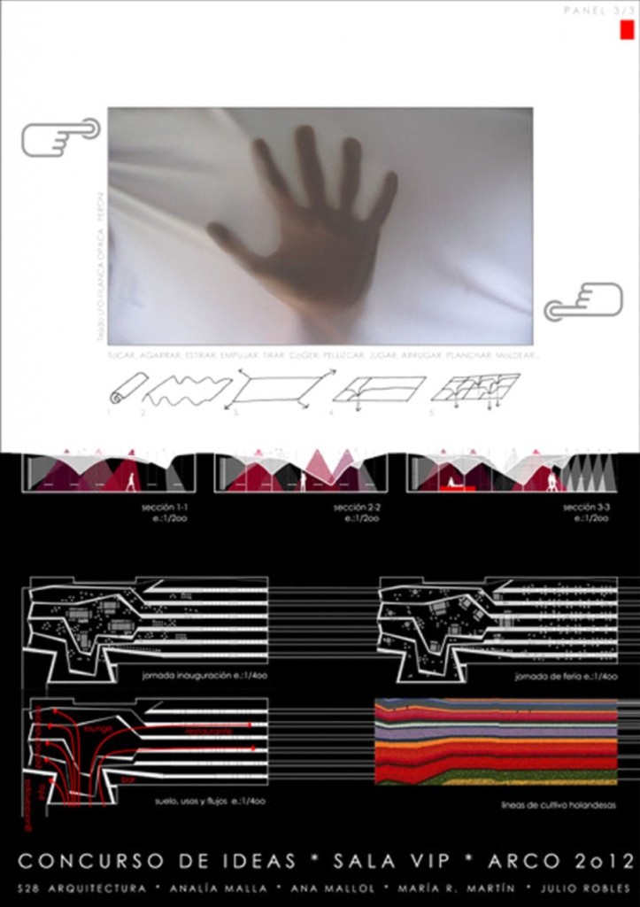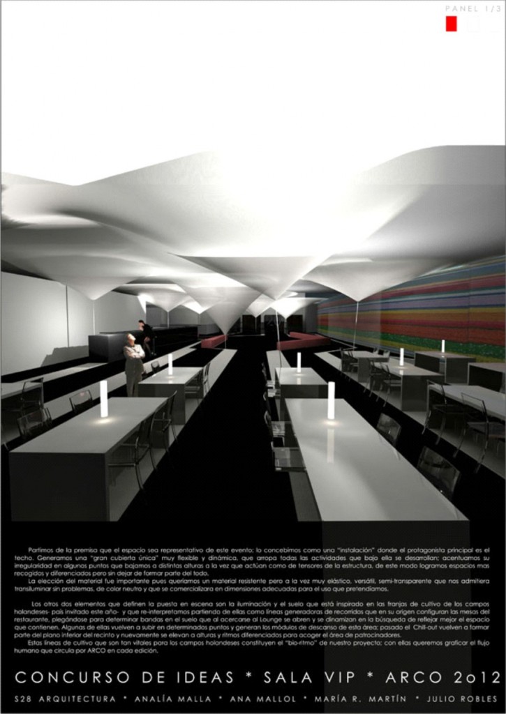Partimos para este concurso con la idea de generar un espacio que se pudiera transformar según los eventos que pudiera acoger. Para ello diseñamos ‘una cubierta flexible’ que en algunos puntos llega a tocar el suelo cubriendo así los pilares de soporte y dando más dinamismo y movimiento al plano superior que, junto con los distintos tonos e intensidad de luz, generan atmósferas más cálidas o frías según lo que se requiera. Completa la escena el ‘gran mural de fondo’ transiluminado, que como este año el país invitado es Holanda hace un guiño a los campos de ese país. El suelo se resolvió en una moqueta negra para conformar un plano totalmente neutro, que no desvíe la atención del visitante y solo sirva de punto de soporte de los elementos protagonistas; el equipamiento también se resolvió en color neutro por este motivo( gris medio). Además y muy importante esta es una muestra de arte, creatividad, innovación y creemos que una cafetería en esta feria debe estar en concordancia con el evento que alberga.